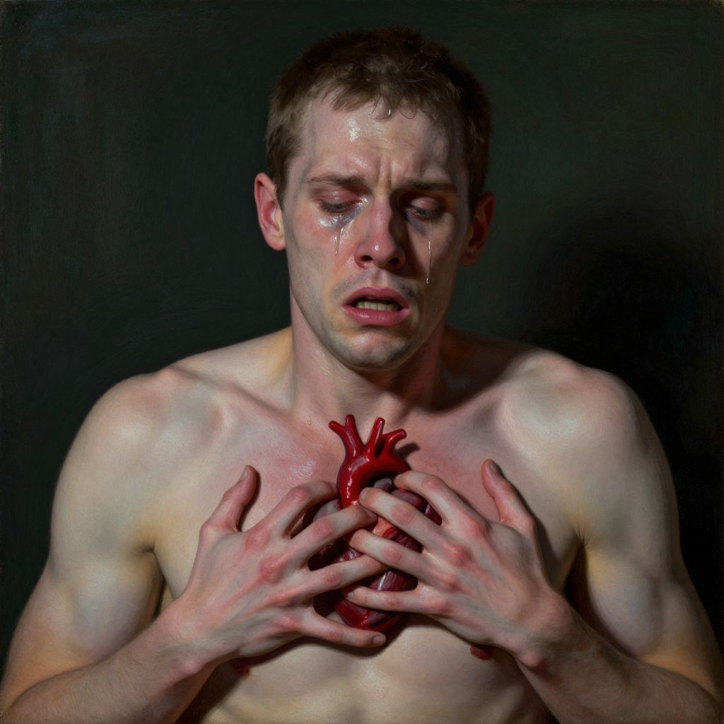 The image depicts a man in a state of intense emotional distress, reaching into his chest with both hands to rip out his own heart. His expression is one of profound sadness and horror, with sweat glistening on his forehead and tears streaming down his face. The man's skin is pale and his muscles are tense, adding to the sense of anguish. The background is a dark, muted green, which contrasts sharply with the man's pale skin and the vibrant red of his heart. The overall composition is tightly framed, drawing the viewer's attention directly to the man's face and the act of tearing out his heart. The painting style is realistic with a touch of impressionism, capturing the texture of the man's skin and the fluidity of his tears. The scene is both haunting and powerful, evoking a strong emotional response from the viewer.
