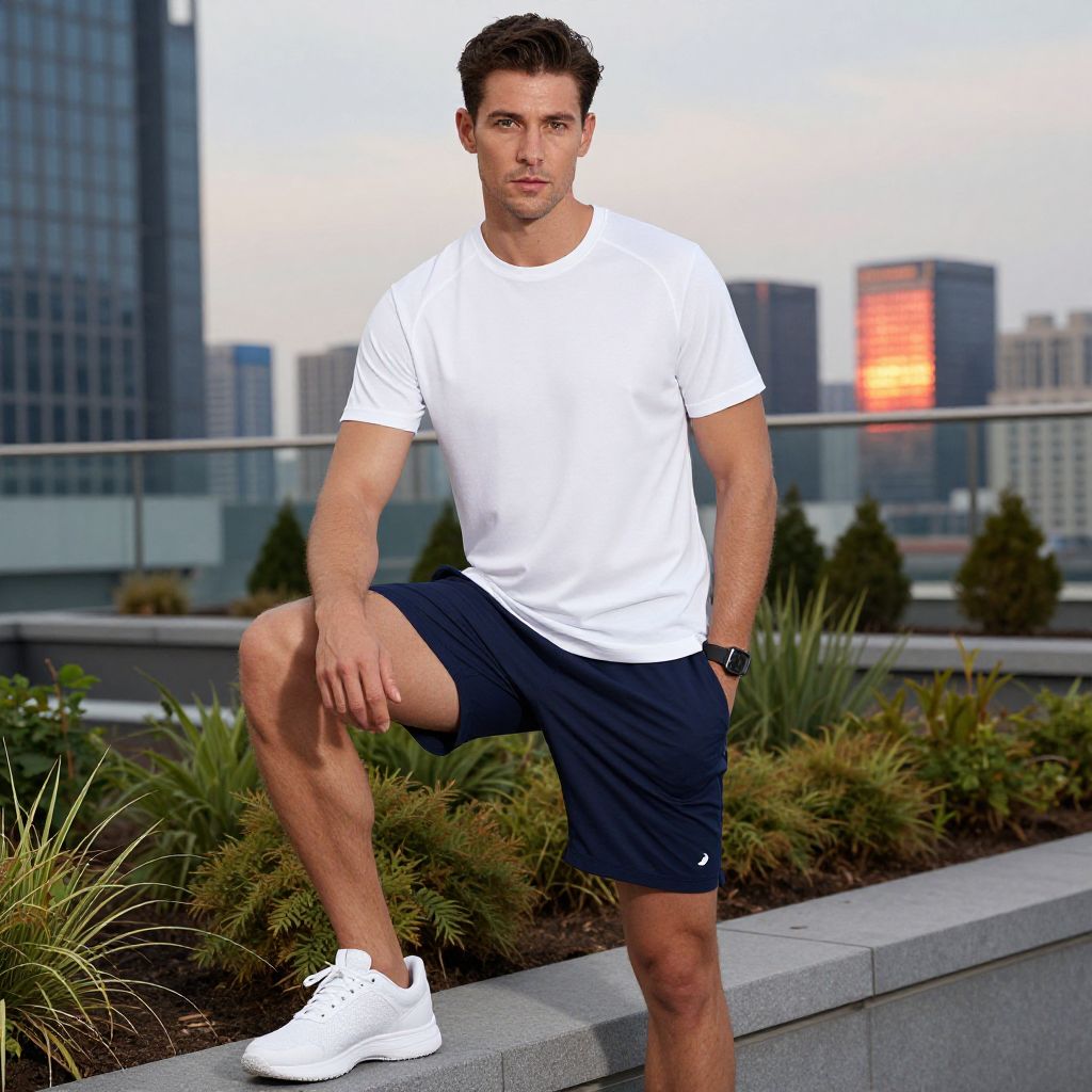 A man, white moisture-wicking crew neck shirt, navy performance shorts, white tennis shoes, sporty and sleek look, rooftop gardens with city views, cameraphone style, focused expression, vibrant sunset reflections. Man has masculine face and piercing eyes