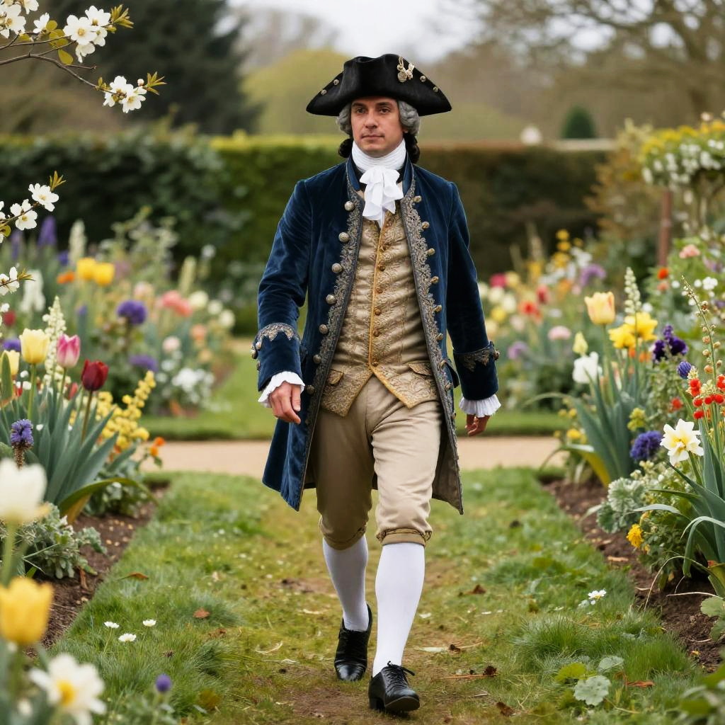 18th century dandy dressed in elaborate rococo attire, powdered wig, lace cravat, standing elegantly in a grand French ballroom, ornate chandeliers, soft candlelight