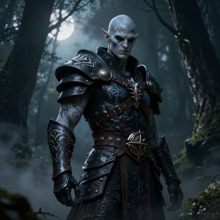 CGI fantasy image of a muscular, bald, blue-skinned elf warrior in dark, detailed armor standing in a misty, moonlit forest.