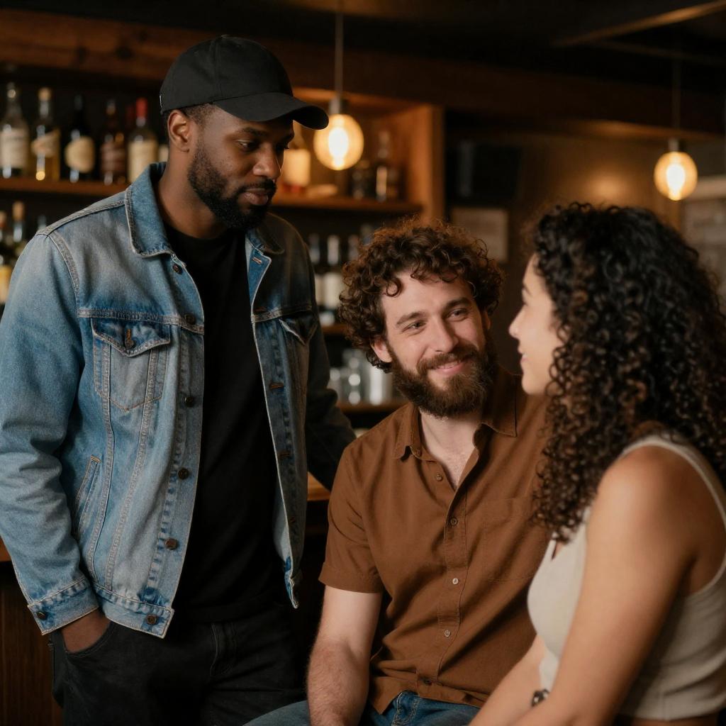 Photograph of three people in a dimly lit bar. Black man in denim jacket and cap stands, looking down. Bearded man with curly hair and brown shirt sits, smiling at woman with long curly hair in sleeveless top. Background has wooden shelves and warm lighting. Woman and bearded man lean forward, engaged. Warm tones, casual clothing.