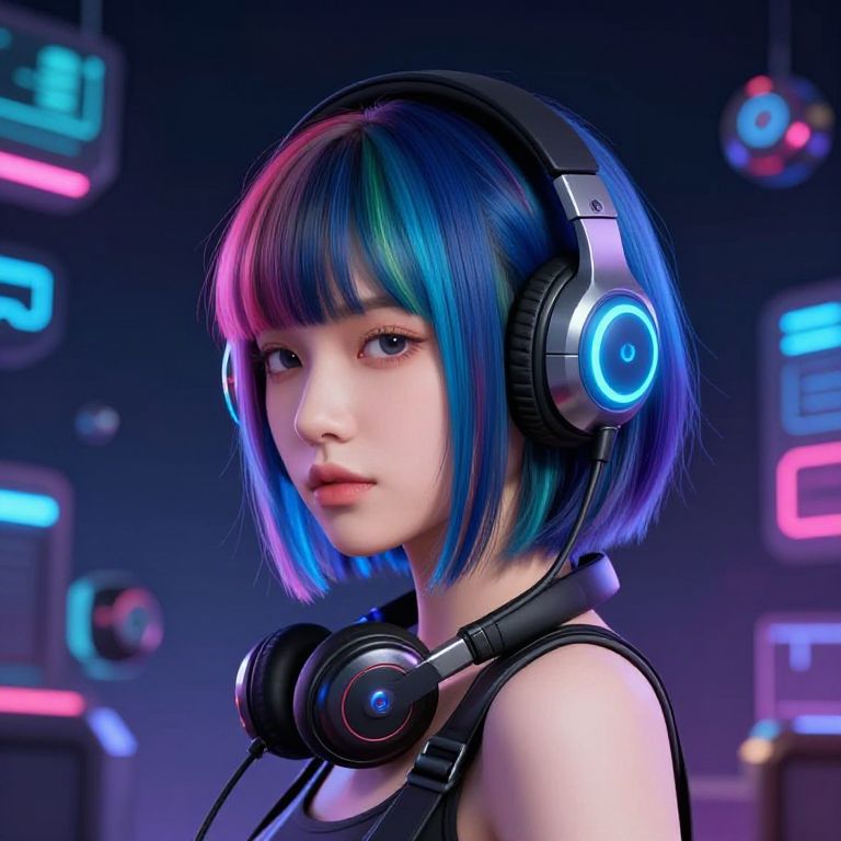Digital art of a young Asian woman with vibrant blue and pink bob haircut, wearing black headphones with glowing blue circles, in a neon-lit futuristic background