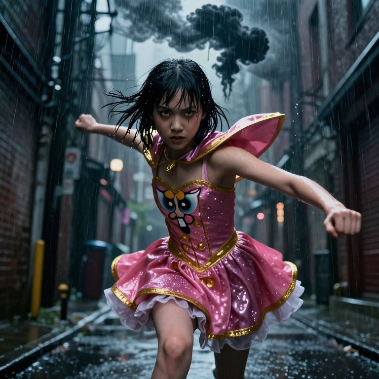 A cinematic shot of a power-packed girl in a dynamic 'blossom powerpuff dress' with golden accents and a built-in cape, fighting off a shadowy dark cloud in a rainy city alley, her face determined with fierce focus, water dripping from her hair as the dress sparkles under stormy lighting