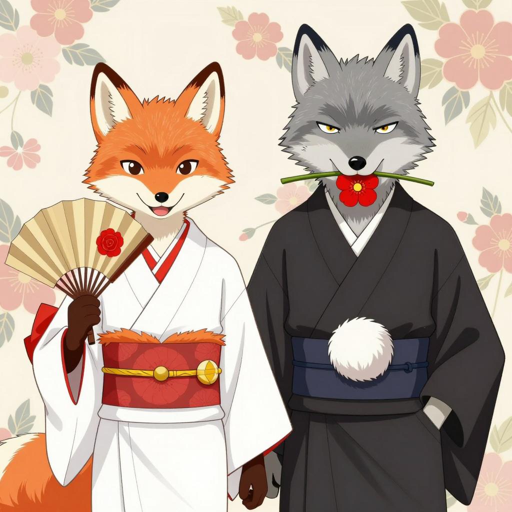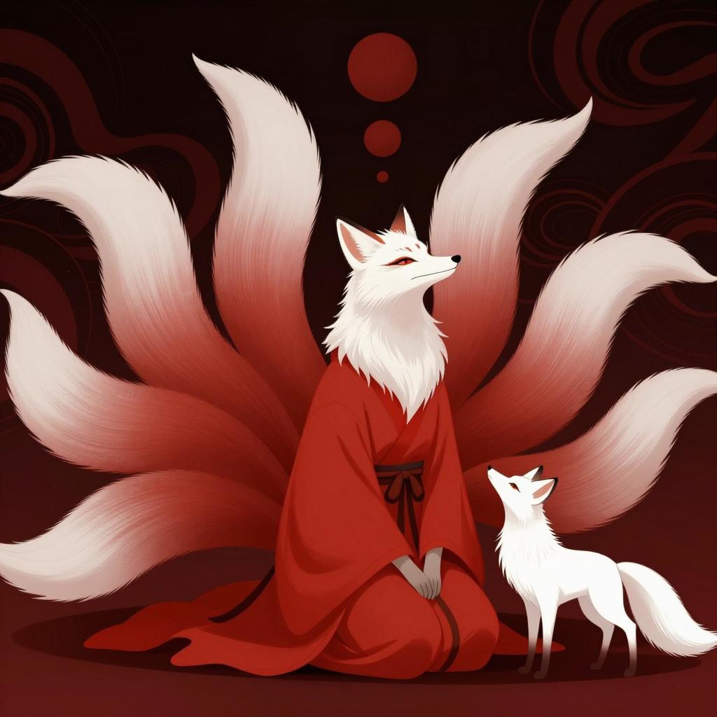 Illustration of a white fox with red markings and black-tipped ears nuzzling a young girl with short brown hair in a bun. The girl wears a black and white kimono, facing the fox with her right hand gently touching its snout. The fox's red eyes are closed. Beige background. Digital art style.