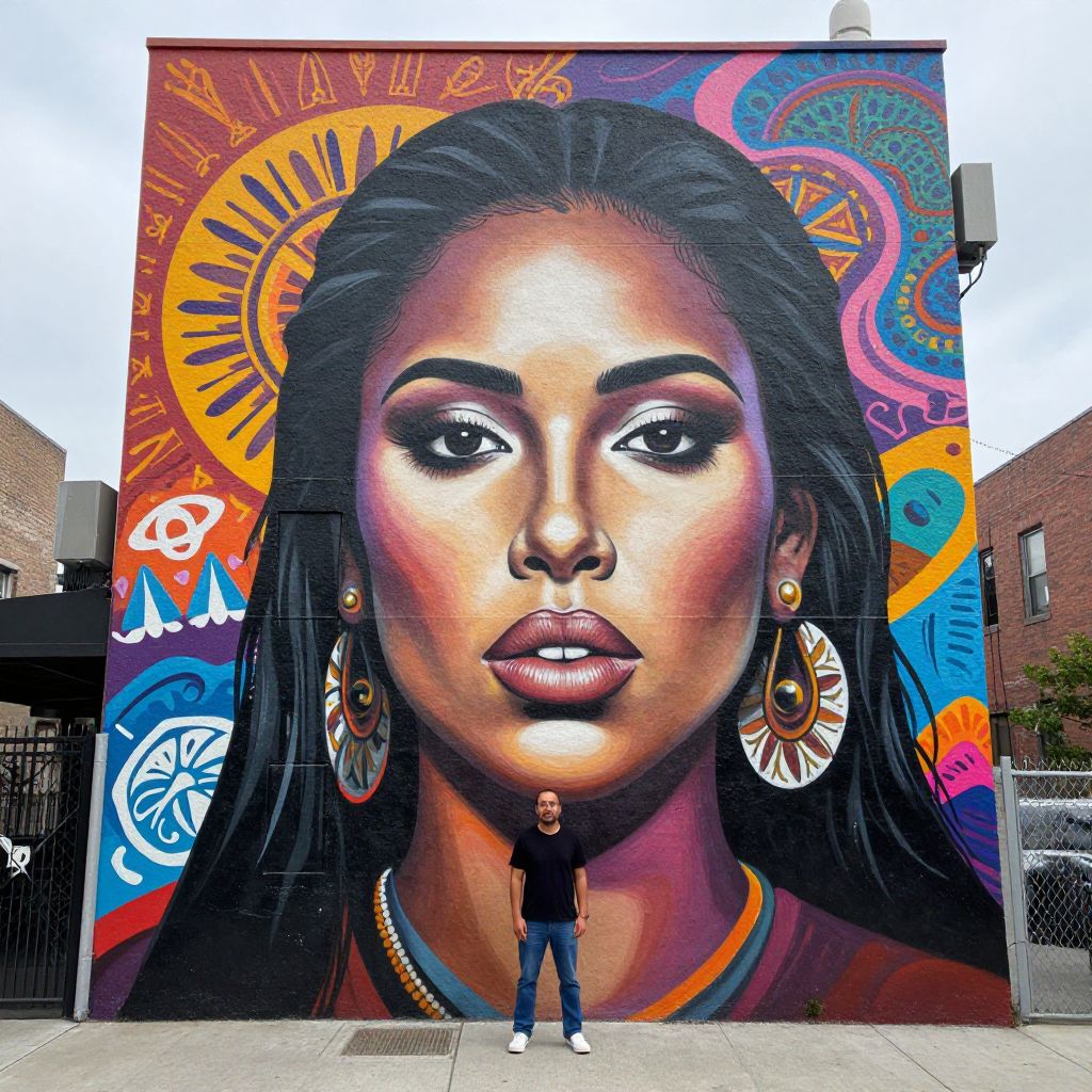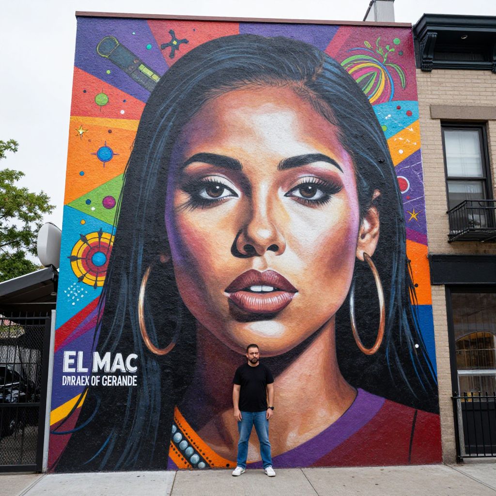 Vivid mural of a woman's face painted by El Mac and Cero dominates a wall in East Harlem, featuring bold colors and intricate details, with a man standing below to emphasize its massive scale.
