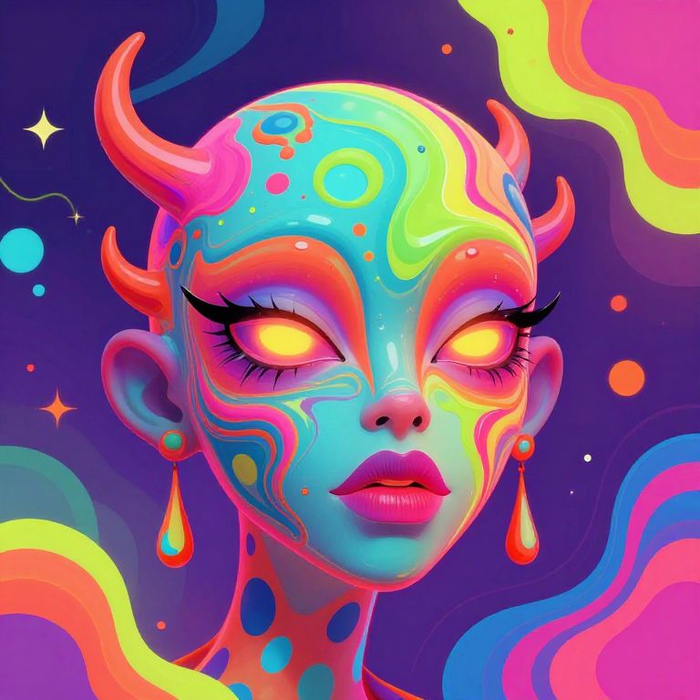 A surreal creature with exaggerated facial features, bright neon colors, abstract background, fluid shapes, glowing eyes, psychedelic art style, high detail