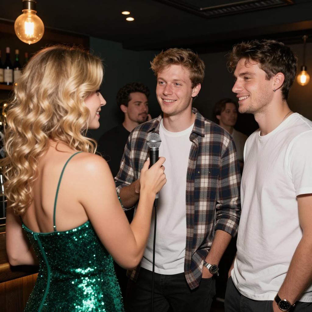 Two men in a jacuzzi, partially submerged. The man on the left has wet, blonde hair, blue shirt, and a gold necklace, with his right hand raised, index finger pointing up. The man on the right has curly, reddish hair, and is looking at the camera. Background: greenery and blurred trees. Water covers their shoulders.