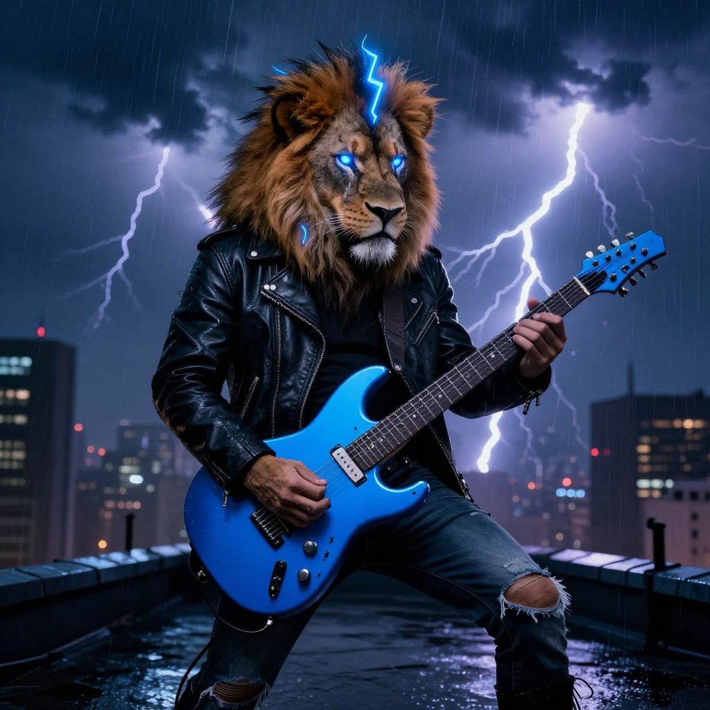 A hyperrealistic cybernetic lion with glowing blue eyes and a thunderbolt-shaped mane plays a bright blue electric guitar on a rooftop in a futuristic city. The scene is set during a stormy night with rain and vivid lightning illuminating the dark sky. The lion wears a black leather jacket and ripped jeans, creating a dramatic, high-tech rockstar vibe, rendered in ultra-detailed 12K with dynamic lighting and shadows.