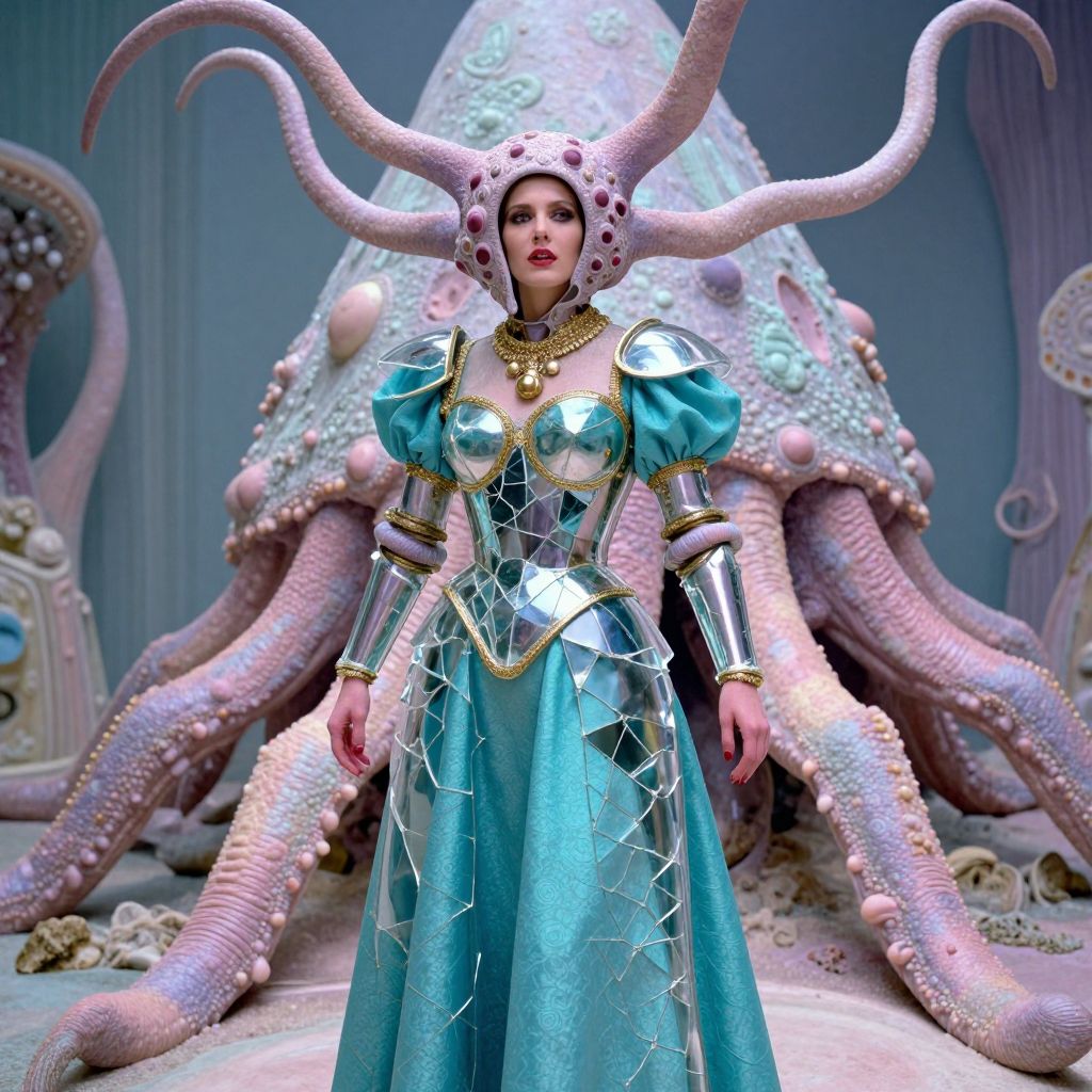 In this 1980s Dark Fantasy scene, a woman stands in a pastel-toned, Gucci-inspired universe, evoking the Wes Anderson style. Her cracked glass armor, resembling a spore, is adorned with intricate, pastel hues and textures, blending seamlessly with the background that resembles the bottom of a Hallucigenia monster. The woman's long, tentacle-like appendages extend from her head, adding a sense of horror and otherworldliness. Her attire, a vibrant turquoise dress with puffed sleeves and gold accents, contrasts sharply with the cracked, cracked glass armor, creating a striking visual effect. The overall composition is dynamic, with the woman's body stretching from the foreground to the background, creating a sense of depth and perspective. The interplay of colors, textures, and shapes creates a visually rich and complex scene, capturing the essence of the 1980s Dark Fantasy genre.