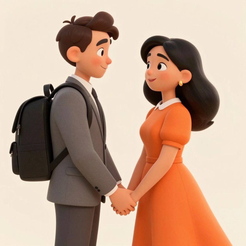 Two animated figures, a man wearing a gray suit and a black backpack and a woman in a vibrant orange dress, stand hand-in-hand against a soft beige background, smiling warmly at each other.