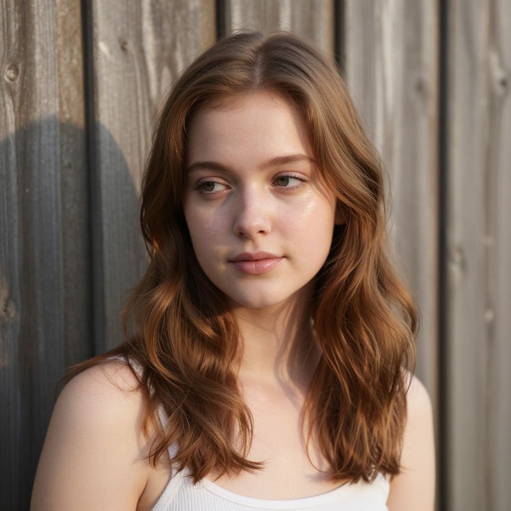 A young woman with a gentle expression sits against the backdrop of an old wooden fence under soft sunlight; her chestnut hair is styled into loose waves framing her face as she gazes softly at something off to the side, exuding warmth and sincerity in every feature from her dewy skin to her thoughtful eyes.