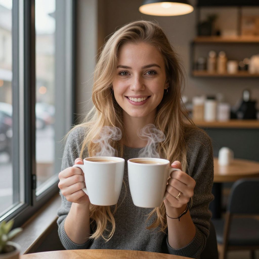 Photograph of a smiling blonde woman with wavy hair, holding two steaming white cups in a cozy, sunlit café.