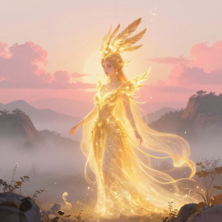 Digital art of a glowing, ethereal woman with fiery feathers, standing in a misty mountain landscape at sunrise. Her golden dress and headdress radi