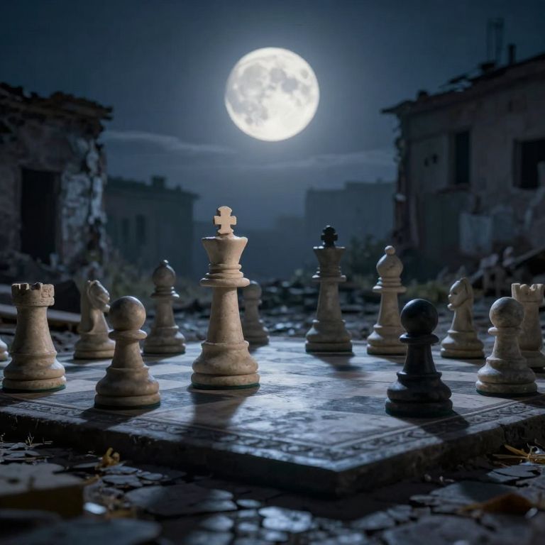 Great stone chess pieces, illuminated by the ethereal glow of a full moon, stand poised on a cobblestone board in an abandoned city, evoking a hauntingly atmospheric and cinematic visual effect.