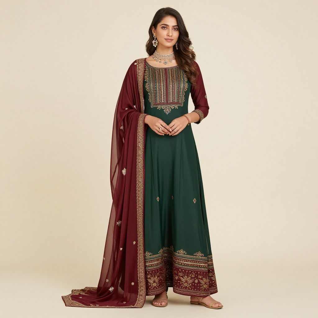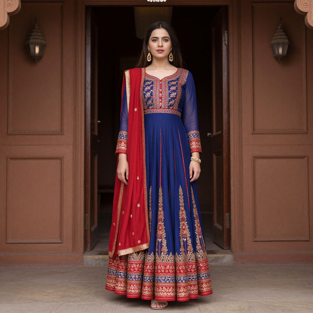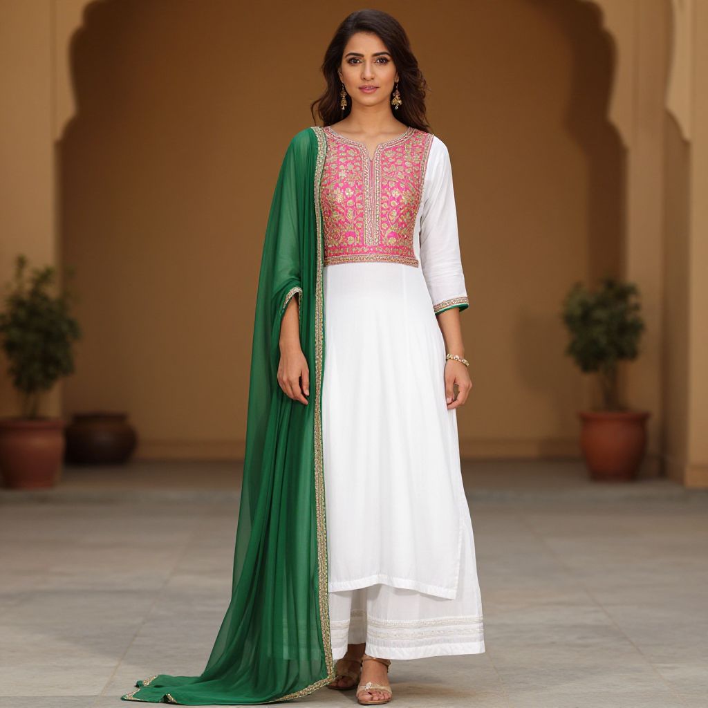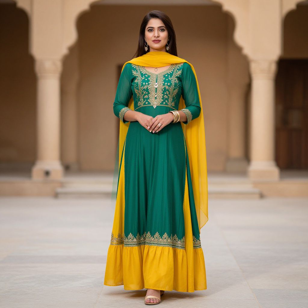 Photograph of an Indian woman with long, wavy black hair, wearing a vibrant yellow traditional kurta with gold embroidery on the chest and sleeves. She pairs it with a sheer red dupatta draped over her shoulders. She has a medium build, fair skin, and is adorned with gold jewelry, including a choker, earrings, and bangles. Her makeup is subtle with pink lipstick. The background is a blurred, bright white space, keeping the focus on her colorful attire. She stands confidently, looking slightly to her left. The image has a crisp, colorful, and well-lit style.