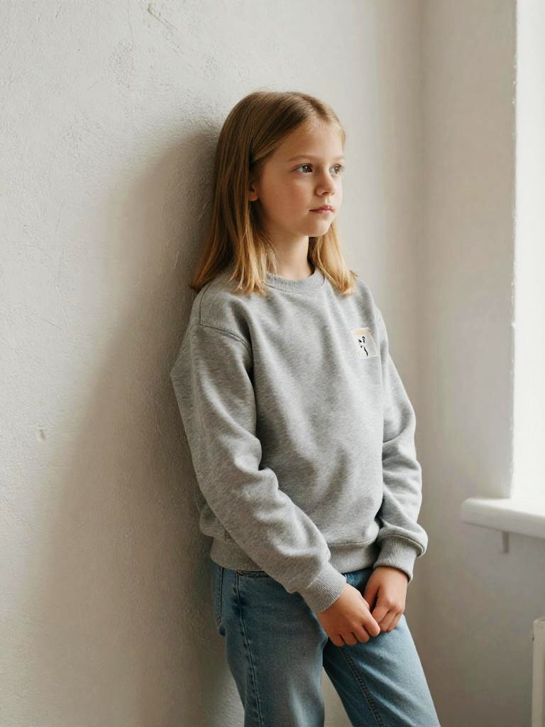 9 years old girl lifestyle photo, light-skinned girl with straight sandy-blonde hair to her shoulders and a thoughtful expression wearing light grey sweatshirt with small graphic and denim jeans, standing relaxed with her back against a textured wall, hands loosely folded in front of her, soft natural window light from the side, cozy minimalist interior, minimal studio corner with slightly rough painted wall