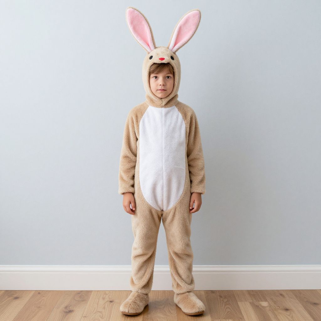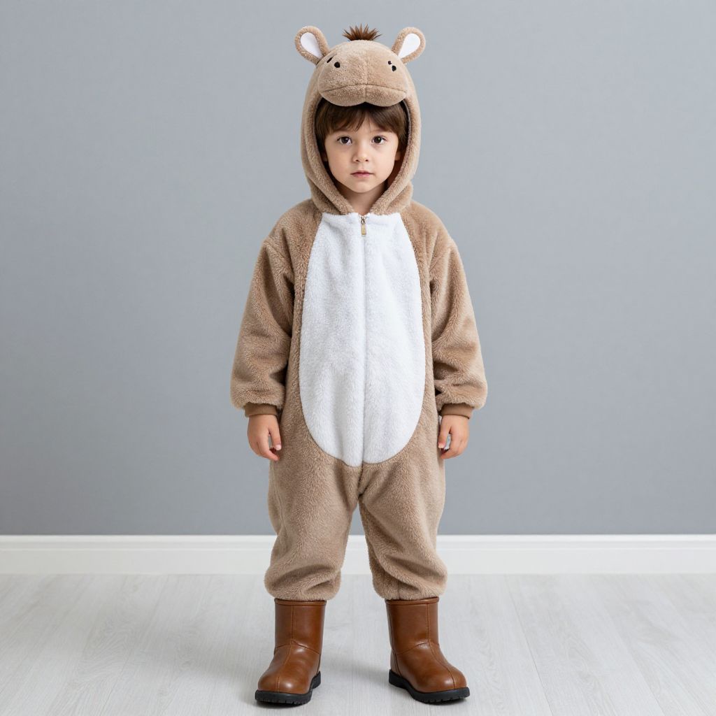 Toddler fleece pajamas, solo, 1boy, male focus, kigurumi, christmas, animal costume, looking at viewer, hood, blurry, standing, indoors, christmas tree, blurry background, cosplay, full body