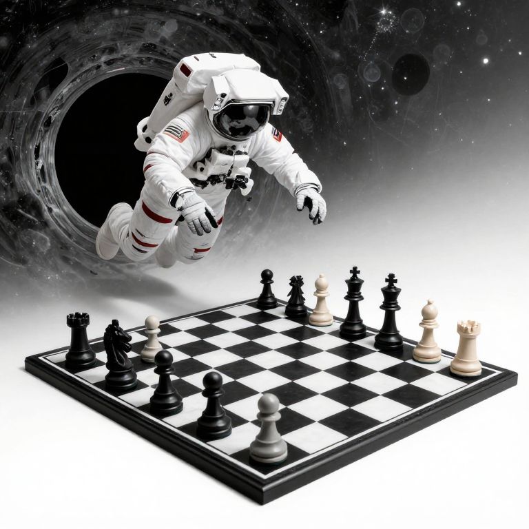 An astronaut barrels through a black hole only to land in a pocket universe shaped like a chessboard, where gravity depends on your next move.