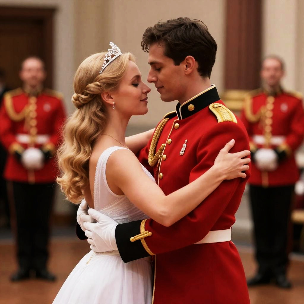 A romantic portrait of a man and woman dancing closely. The man wears a formal red military uniform with gold epaulettes and white gloves, while the woman is dressed in a white sleeveless gown and a sparkly tiara, her blonde wavy hair styled elegantly. Both have their eyes closed and smiles on their faces, embracing intimately. The background features blurred figures of uniformed dancers and wooden columns, suggesting a ceremonial or formal indoor setting.