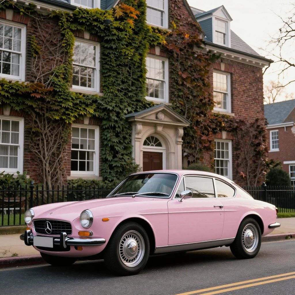Preppy car parked in front of a classic ivy-covered university building, sleek lines, pastel colors, vintage yet modern, early morning light, stylish and sophisticated vibe