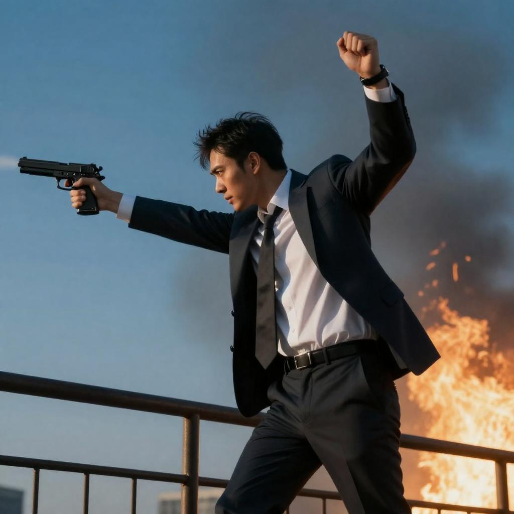 Man in dark suit, holding a gun, leaning against a metal railing, intense expression, blue sky background, fire in the distance, dynamic motion blur, short dark hair, right arm raised, left arm holding gun, action scene.