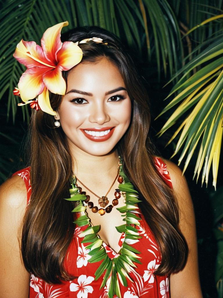Hawaiian luau outfit woman, 1girl, solo, flower, necklace, hair ornament, hair flower, jewelry, smile, long hair, flower necklace, brown hair, realistic, lips, dress