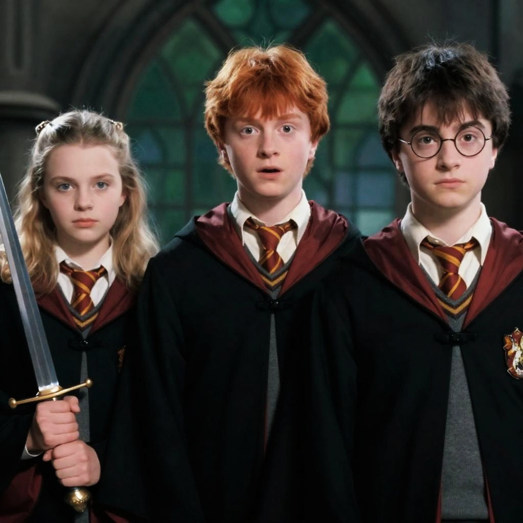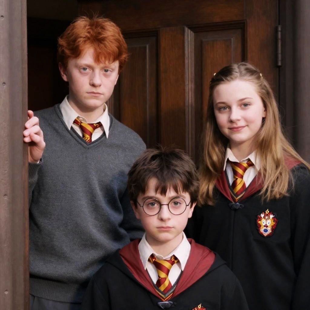 Portrait of four serious teenagers standing closely together against a dark background. The group includes a blonde girl with blue eyes and light makeup wearing a black vest and white shirt, a boy with glasses and light brown hair in the center, a boy with brown hair and an intense expression on the right, and a red-haired girl with blue eyes holding an orange book in the front. All are dressed in formal school uniforms with ties and sweaters.