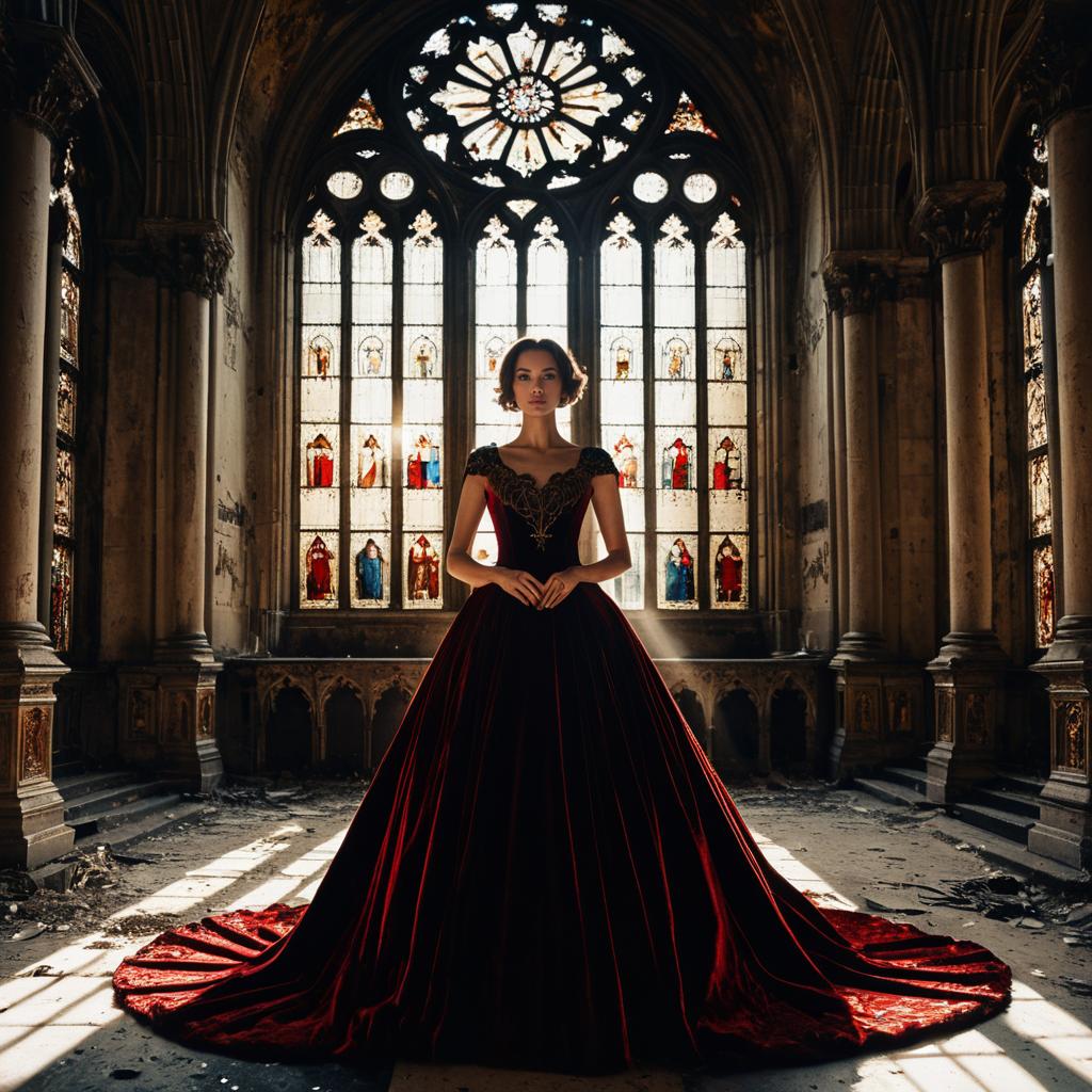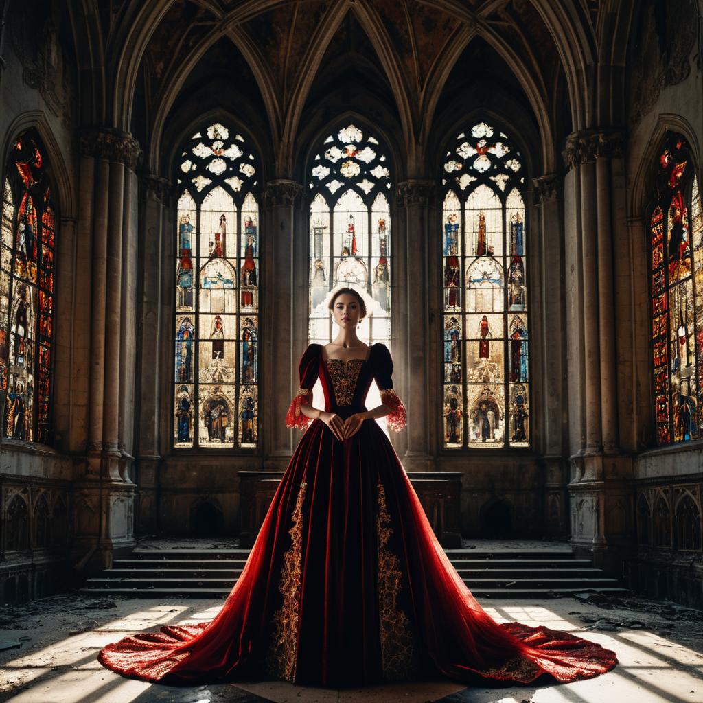 Aristocratic Woman in Red Velvet Gown in Abandoned Cathedral