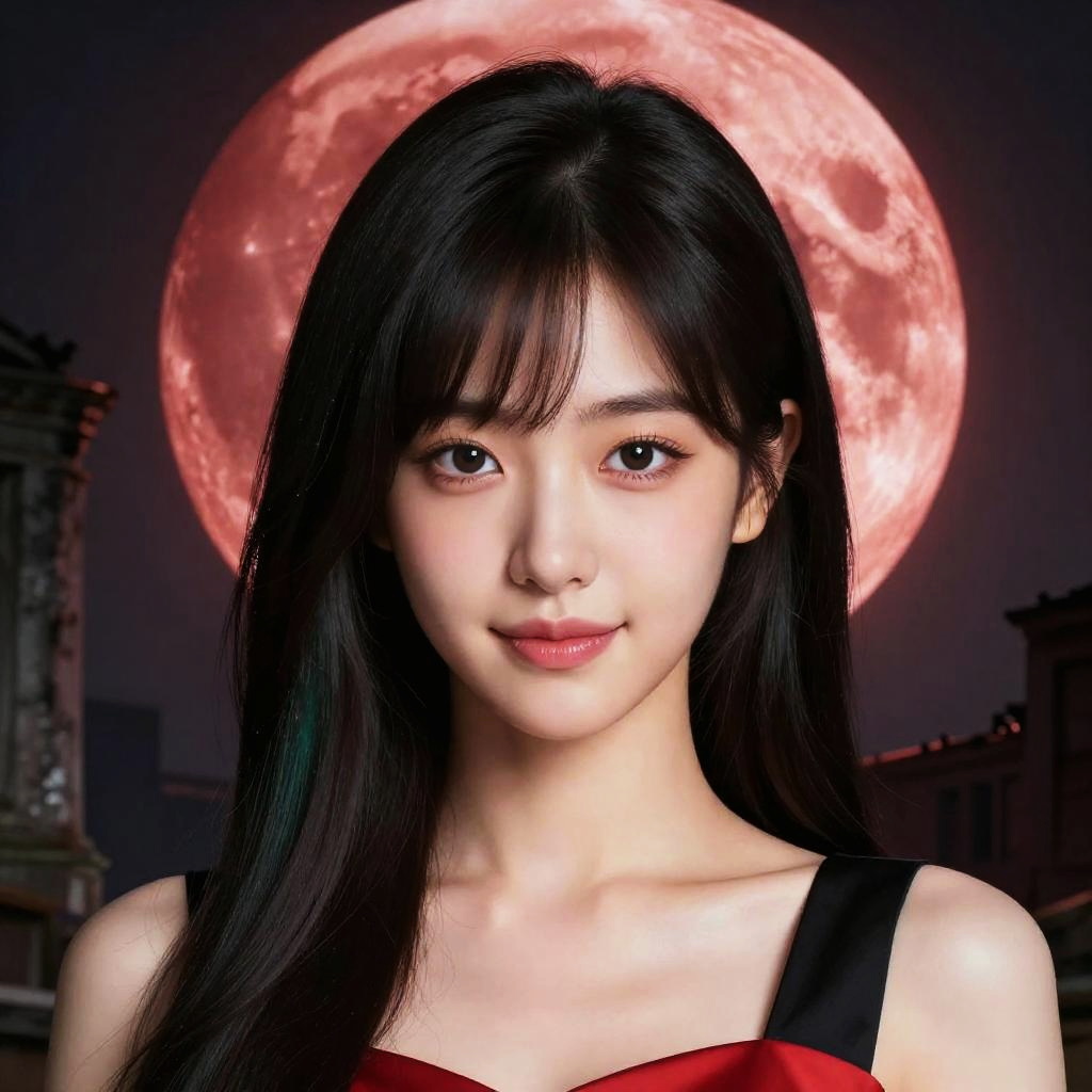 Masterpiece, best picture quality, high quality, beautiful girl, Japanese, Japanese school girl, popular Korean makeup, detailed, swollen eyes, detailed eyes, detailed skin, beautiful skin, ultra high resolution, (reality: 1.4), very beautiful, slightly younger face, slender, (ultra realistic), (illustration), (high resolution), (8K), (highly detailed), (best illustration), (beautifully detailed eyes), (super detailed), (wallpaper), (detailed face), looking at viewer, fine details, detailed face, pureerosfaceace_v1, smiling, looking straight ahead, angle from waist up, realistic photo, bright lighting, professional lighting, black hair (some green), long hair, dark ruins, big red moon, gorgeous red and black dress, mature woman, long stylish bangs