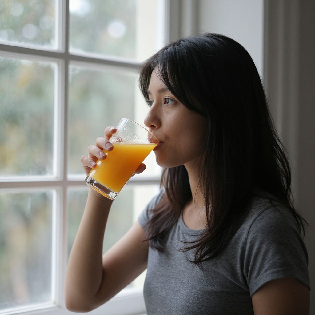 Woman sipping orange juice near a window, her gaze directed outward as sunlight filters through the panes.
