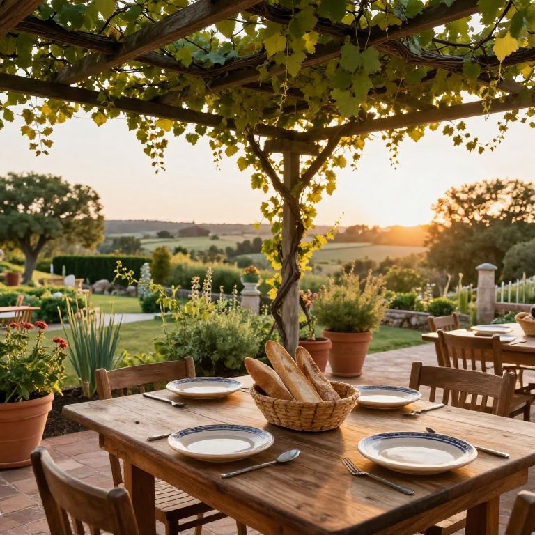Rustico outdoor dining area under a pergola covered with lush grapevines, wooden table set with handmade ceramic plates and rustic bread baskets, surrounded by an herb garden and terra cotta pots, sun setting casting golden tones, peaceful and inviting scene