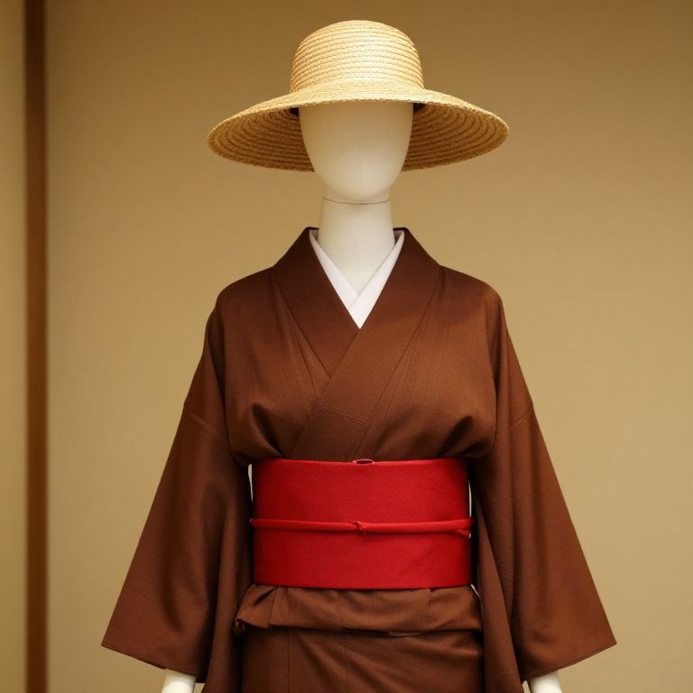 Mannequin wearing a beige robe with a green headpiece and a brown belt. The mannequin has a serious expression on its face and is standing in front of a building.