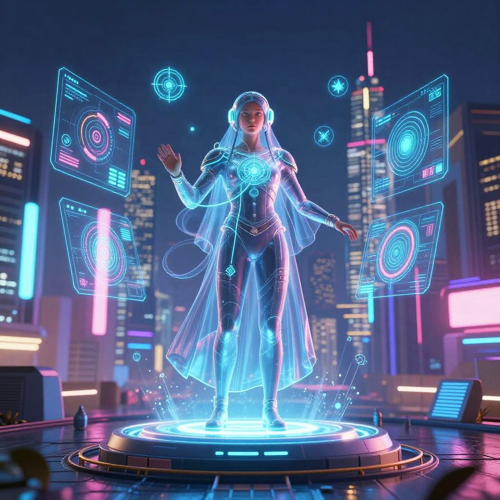 A CGI digital artwork features a glowing, translucent woman standing on a futuristic circular platform in a neon-lit cityscape at night. She is encased in a holographic, blue and white light that outlines her figure, including a long, flowing veil. Surrounding her are floating holographic screens displaying geometric patterns and symbols. The background shows tall skyscrapers with colorful neon lights, enhancing the cyberpunk aesthetic. The woman's expression is neutral, and her hands are raised slightly. The platform emits a bright blue light, illuminating her form. The overall style is highly detailed and vibrant, with a focus on futuristic technology and neon colors.
