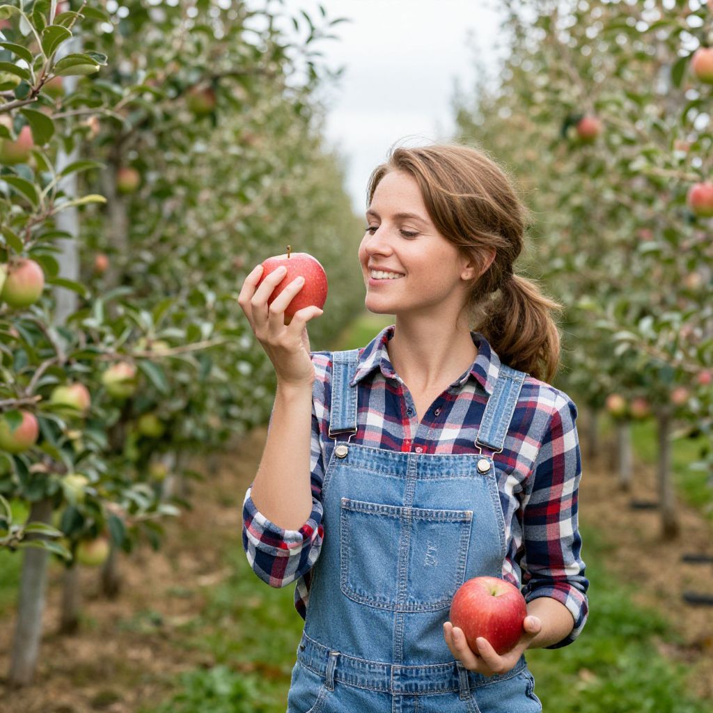 Smiling woman enjoying apple picking in a vibrant orchard, holding a fresh red apple while surrounded by rows of lush green trees laden with fruit.