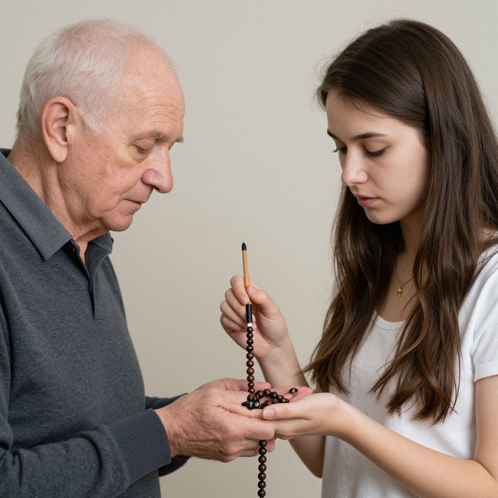 An elderly man and a young woman stand in a realm where time flows through their hands; as she paints with a delicate brush, his hand cradles a string of beads that seem to weave the passage of years, defying the boundaries of reality.