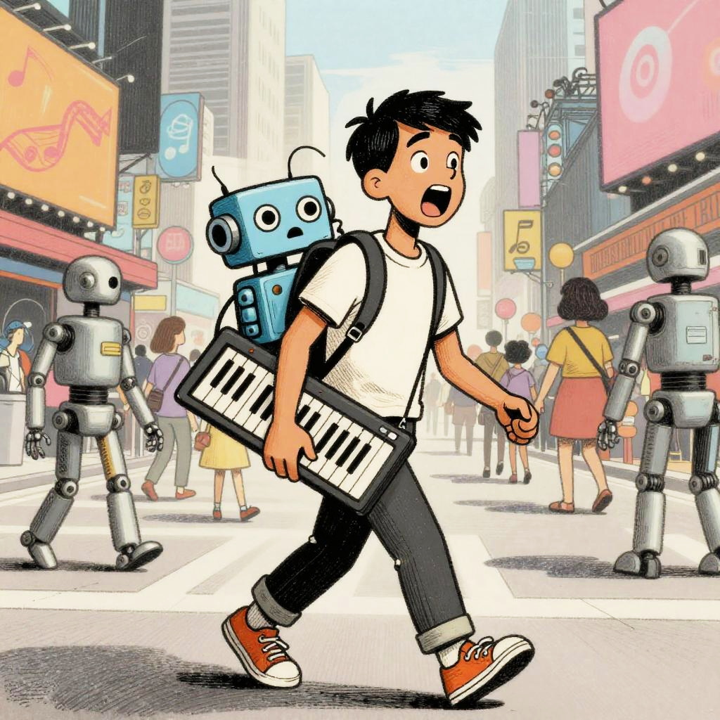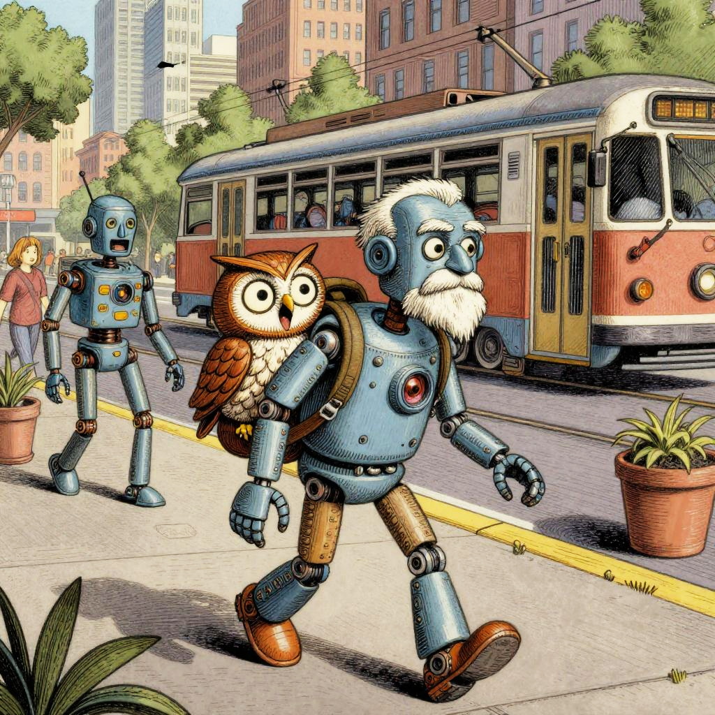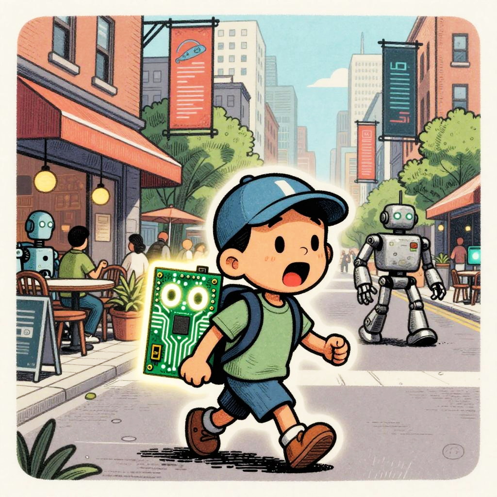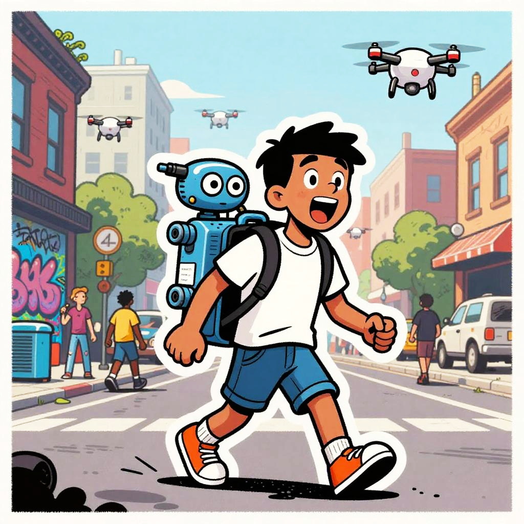 Harsh Flash Photography a cartoon in the style of a wood etching, 4 colors only. In this scene, a young android boy with cap is carrying a glowing circuit board toy in his backpack walking down a busy street. The vibrant cityscape is in the background, with a mix of busy robot cafe terraces and roving data banners going about their day. The glowing circuit board toy has wide open eyes and is exclaiming in amazement