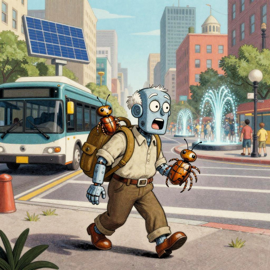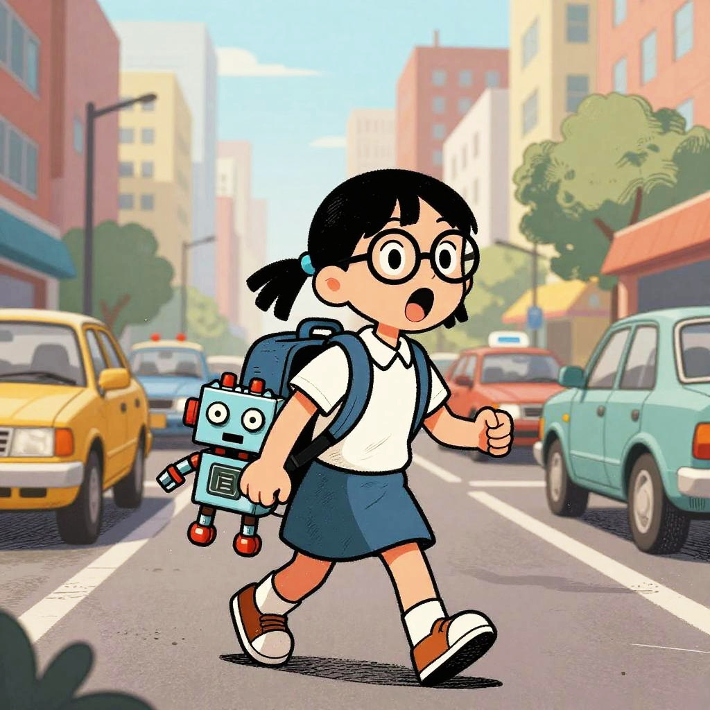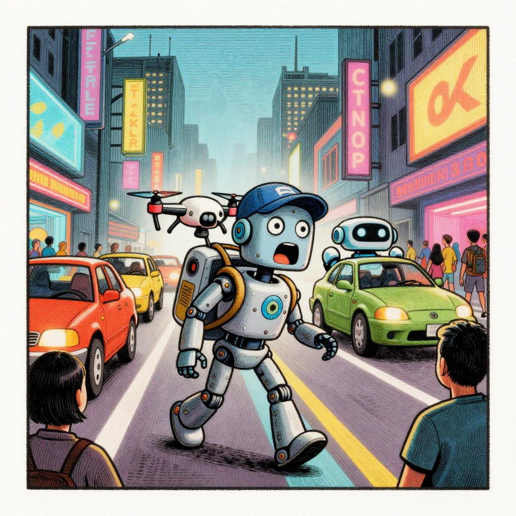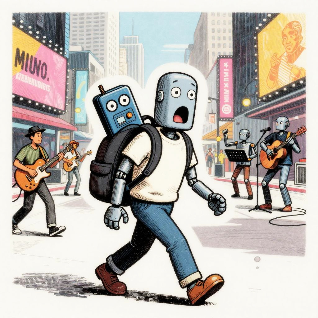 Harsh Flash Photography a cartoon in the style of a wood etching, 4 colors only. In this scene, a young android boy with cap is carrying a glowing circuit board toy in his backpack walking down a busy street. The vibrant cityscape is in the background, with a mix of busy robot cafe terraces and roving data banners going about their day. The glowing circuit board toy has wide open eyes and is exclaiming in amazement