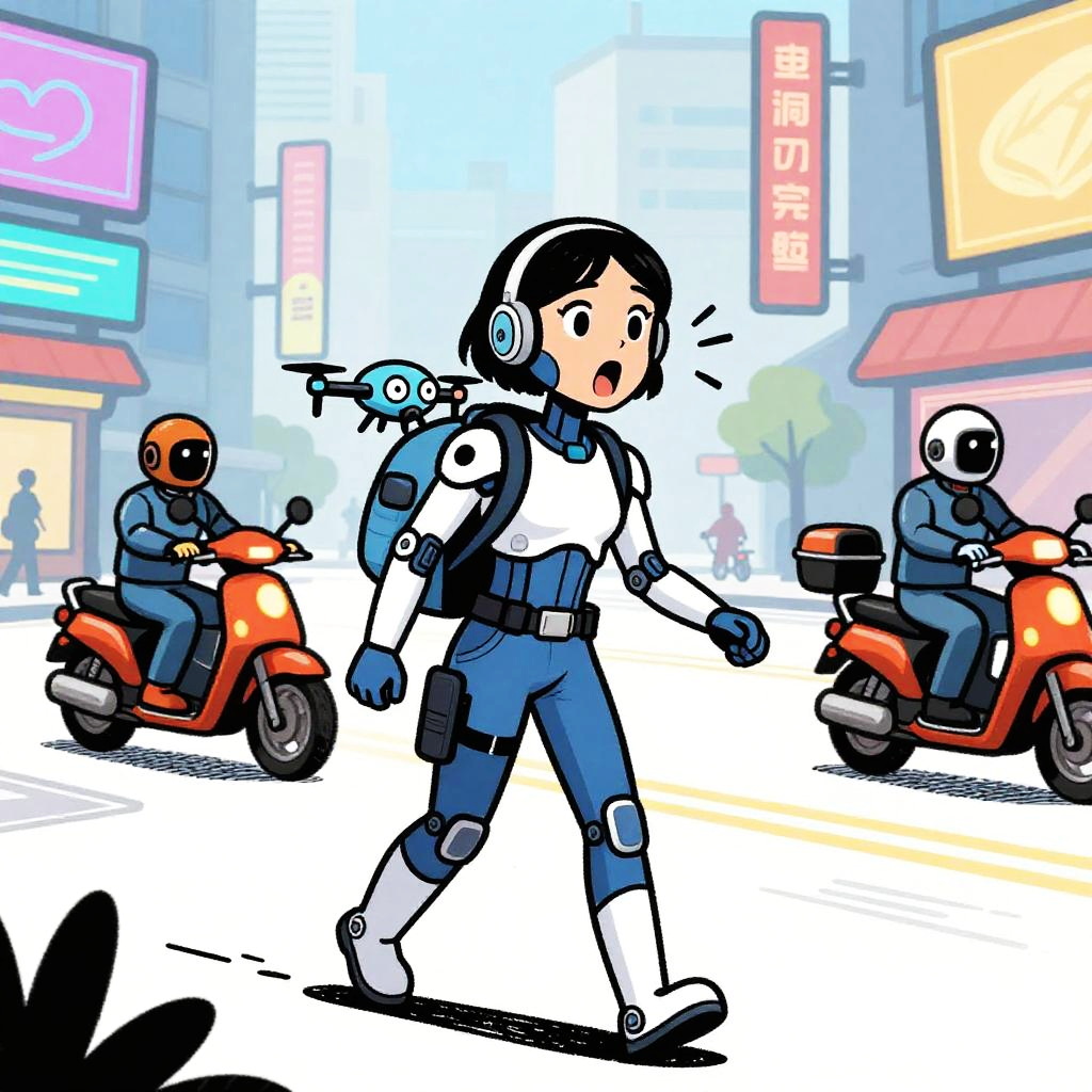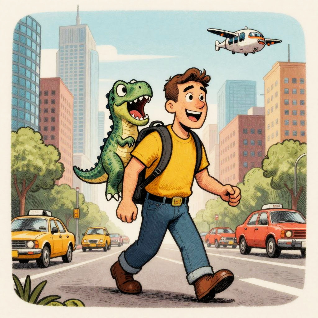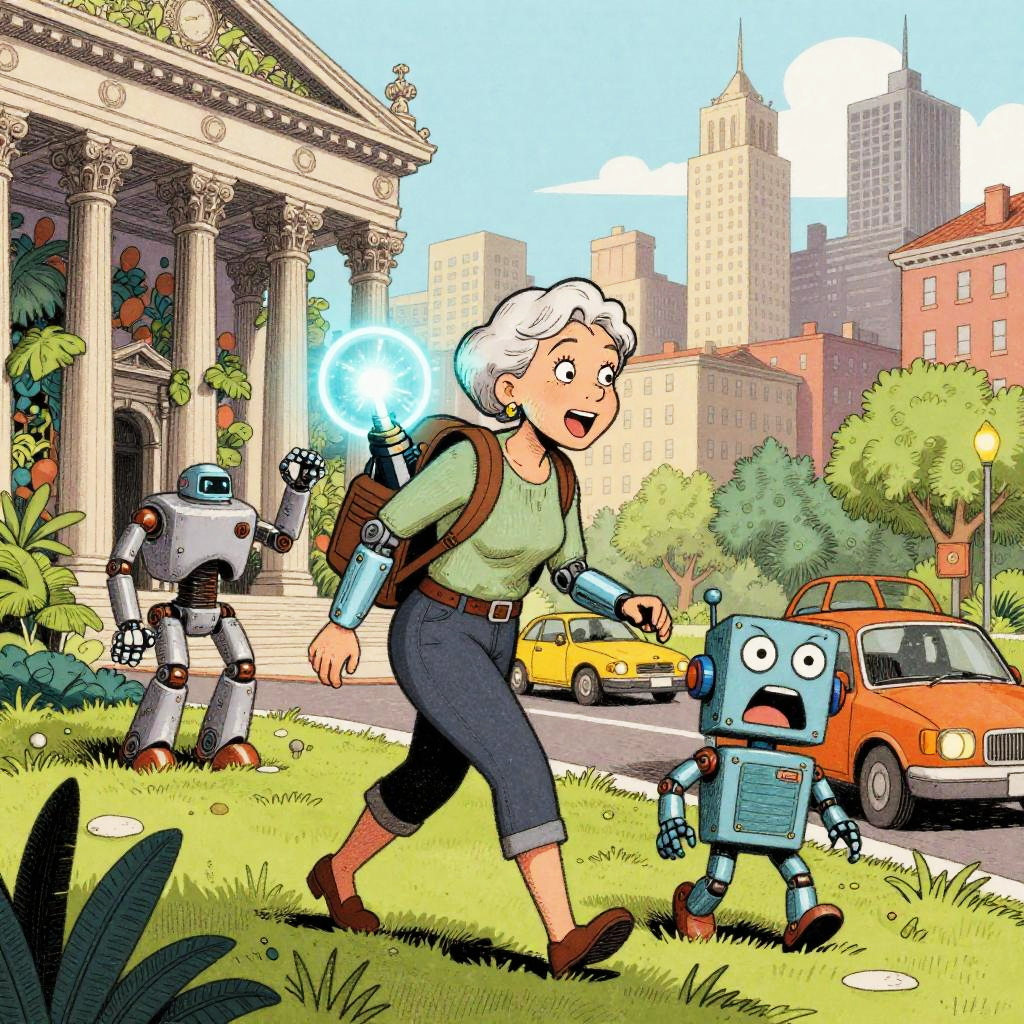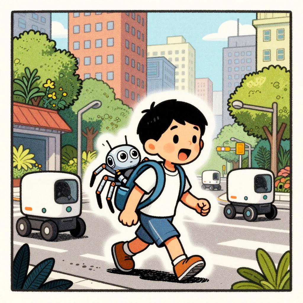Harsh Flash Photography a cartoon in the style of a wood etching, 4 colors only. In this scene, a young android boy with cap is carrying a glowing circuit board toy in his backpack walking down a busy street. The vibrant cityscape is in the background, with a mix of busy robot cafe terraces and roving data banners going about their day. The glowing circuit board toy has wide open eyes and is exclaiming in amazement