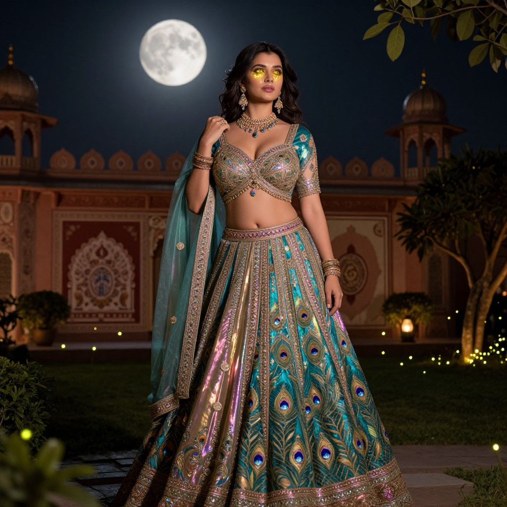 A modern fantasy setting in a palace garden at night, where a woman in a luxurious peacock design lehenga with iridescent silk and metallic accents stands under a glowing moonlight, her golden eyes reflecting the stars, surrounded by fireflies and traditional Indian motifs in the background.. The woman has big tits and cute face