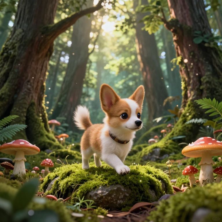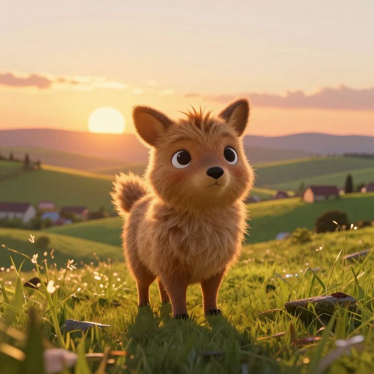 Wolfoo standing on a hill during sunset, warm golden light casting long shadows, whimsical and friendly vibe, detailed fur texture, expressive big eyes, background of rolling green meadows and a peaceful village, digital painting style