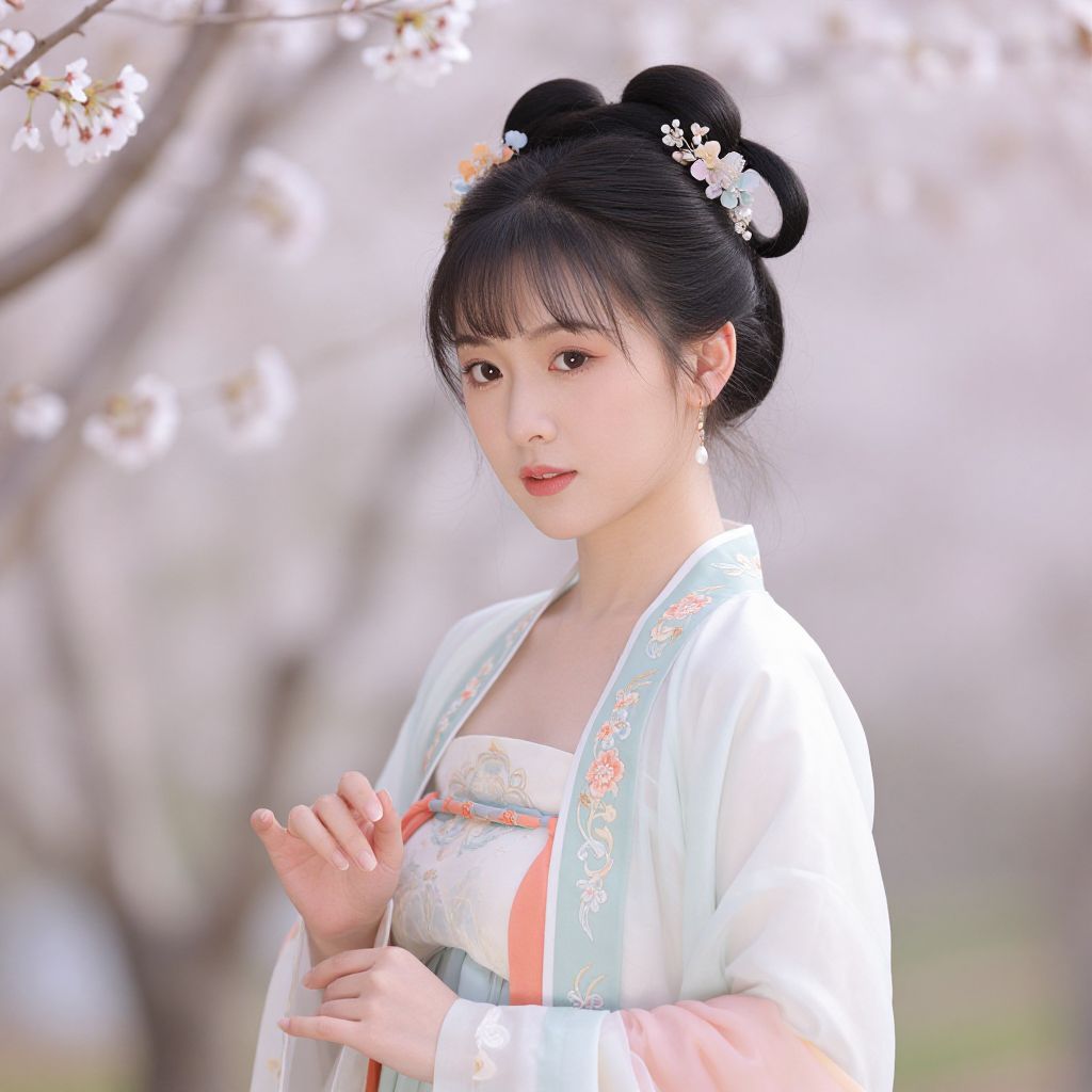 A beautiful Chinese woman in traditional pastel-colored clothing, adorned with floral hair accessories and earrings, stands amidst a serene, cherry blossom-filled environment.
