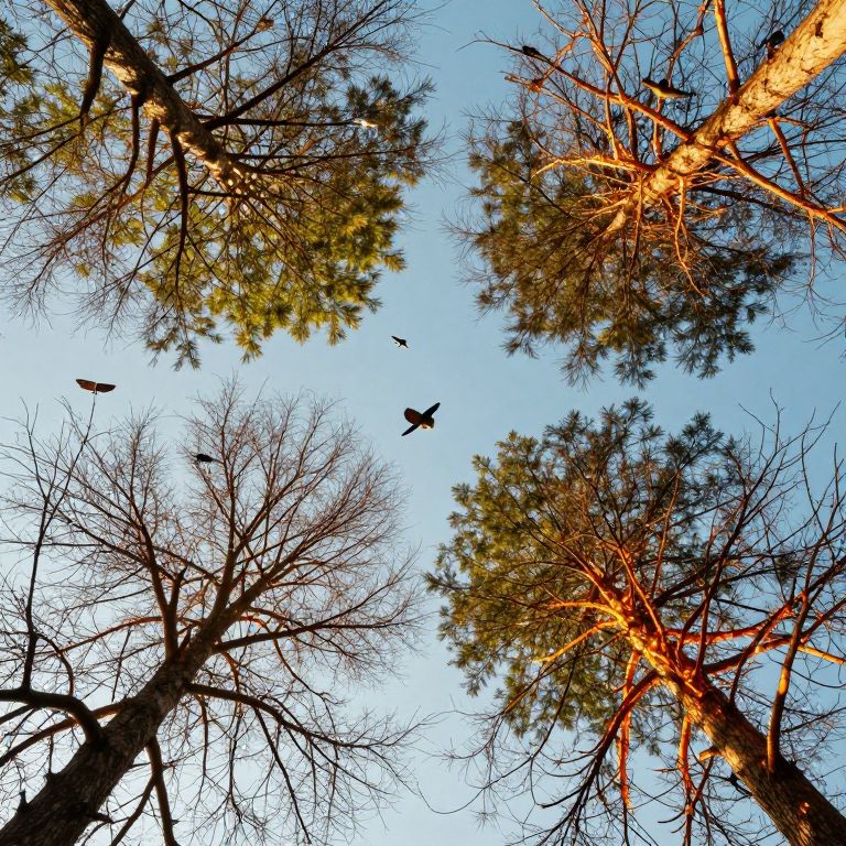 Photograph capturing a bird's-eye view of tall, leafless trees with some evergreen trees, against a clear blue sky. The trees' trunks and branches, some with bright orange bark, stretch upward, creating a natural, circular frame. Two birds are in mid-flight near the center, adding dynamic movement. The contrast between the dark, bare branches and the bright sky emphasizes the trees' intricate textures. The image evokes a sense of height and natural beauty, with the birds providing a lively focal point.