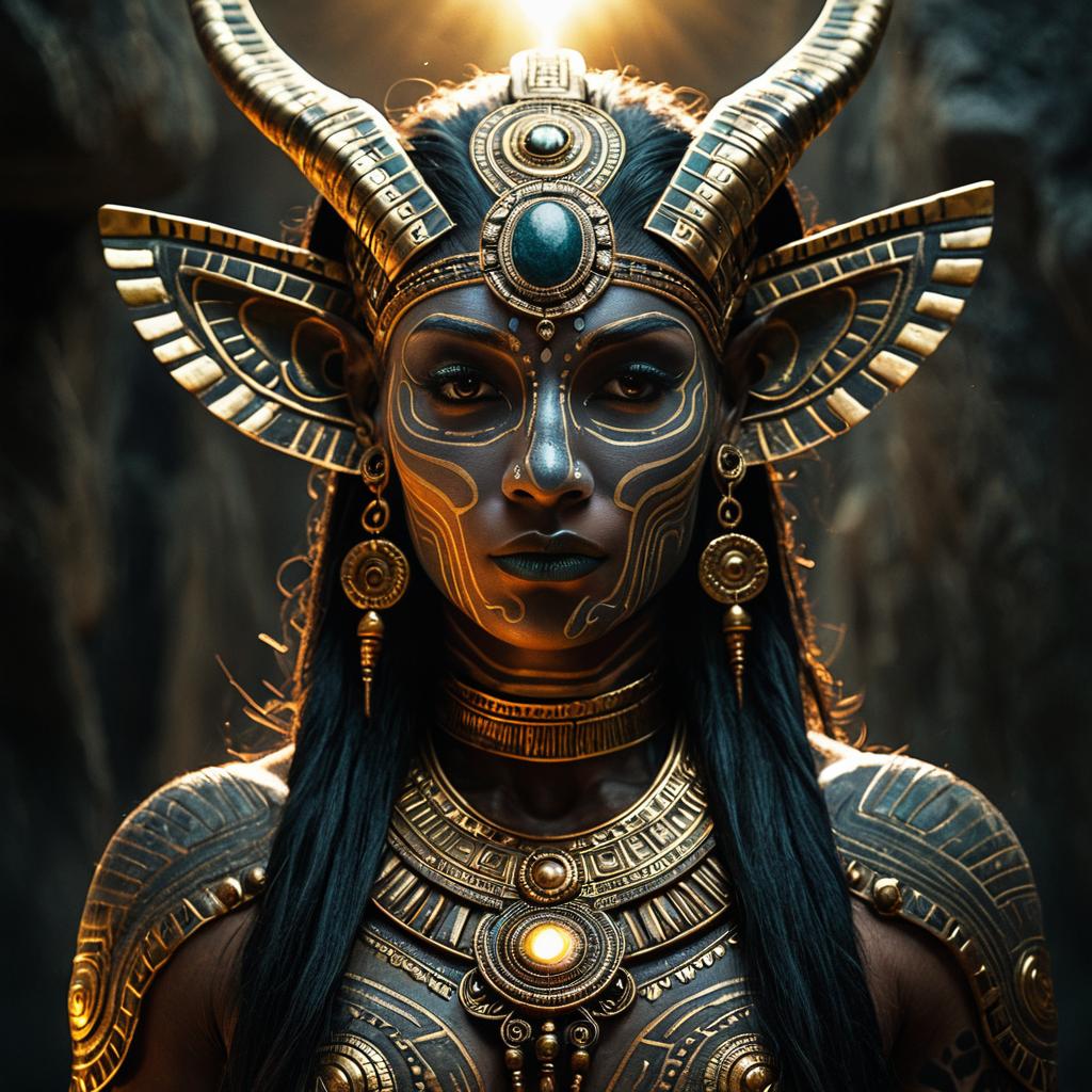 Male Shamanic alien creature portrait with a monochrome effect and deep spiritual atmosphere. The creature has dark brown skin, tribal paint on his face, knowing smile, depicted with high detail to evoke a demigod quality.