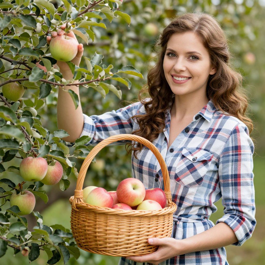 Photograph of a smiling young woman with wavy brown hair, wearing a plaid shirt, picking apples from a tree and holding a basket filled with