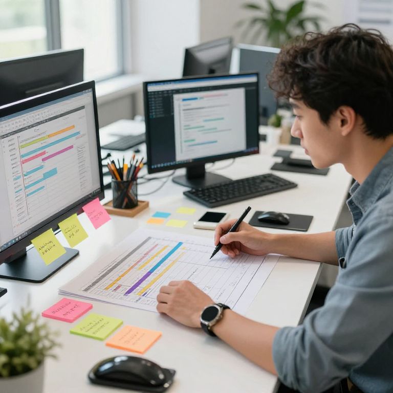 Plan creator at work, surrounded by colorful sticky notes and digital devices, crafting a detailed project timeline, modern office environment with natural light, focused expression, organized workspace, high-tech tools, creative and productive atmosphere