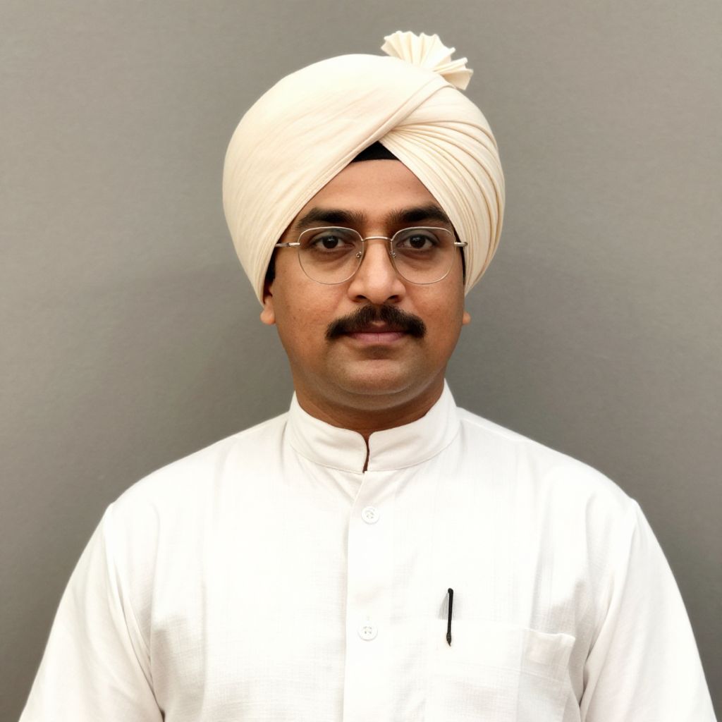 Photograph of a middle-aged South Asian man with medium brown skin, a black mustache, and wearing round, thin-rimmed glasses. He has a white turban wrapped around his head and is dressed in a plain white kurta with a high collar. The background is a plain, gradient gray. The image is well-lit with even lighting, highlighting his facial features and attire. His expression is neutral, and he is centered in the frame from the waist up.