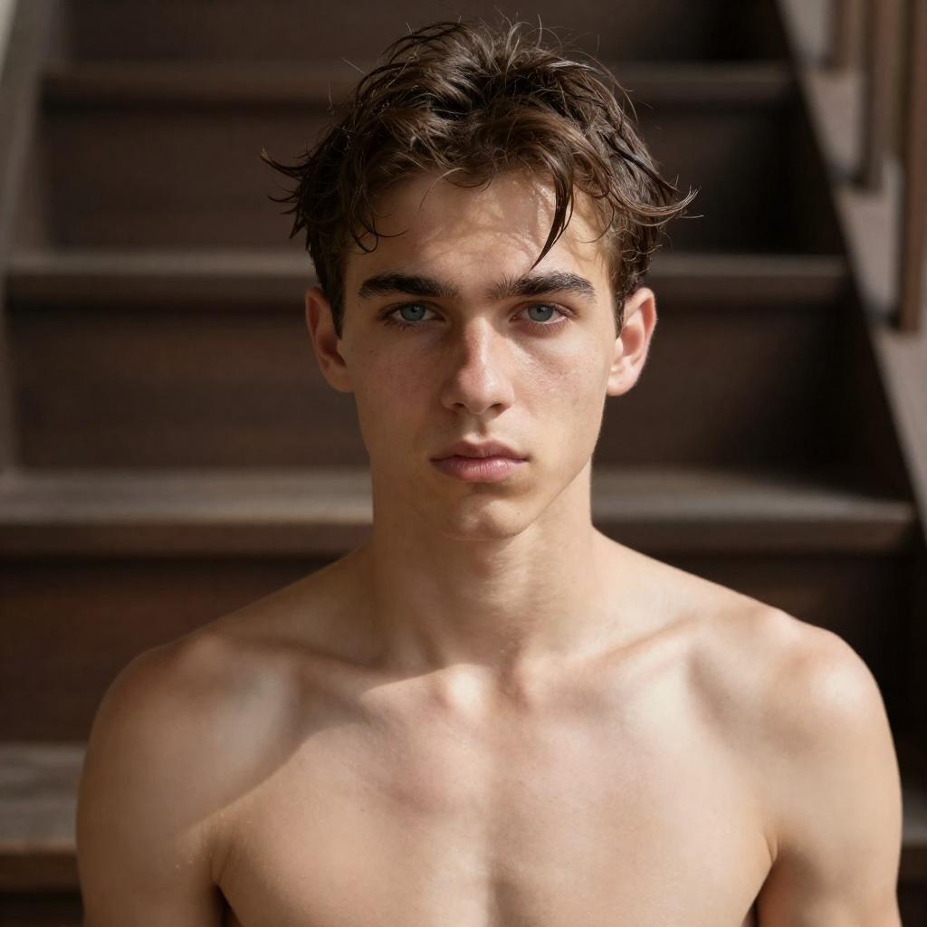Three Young Men in Sunlit Tiled Room