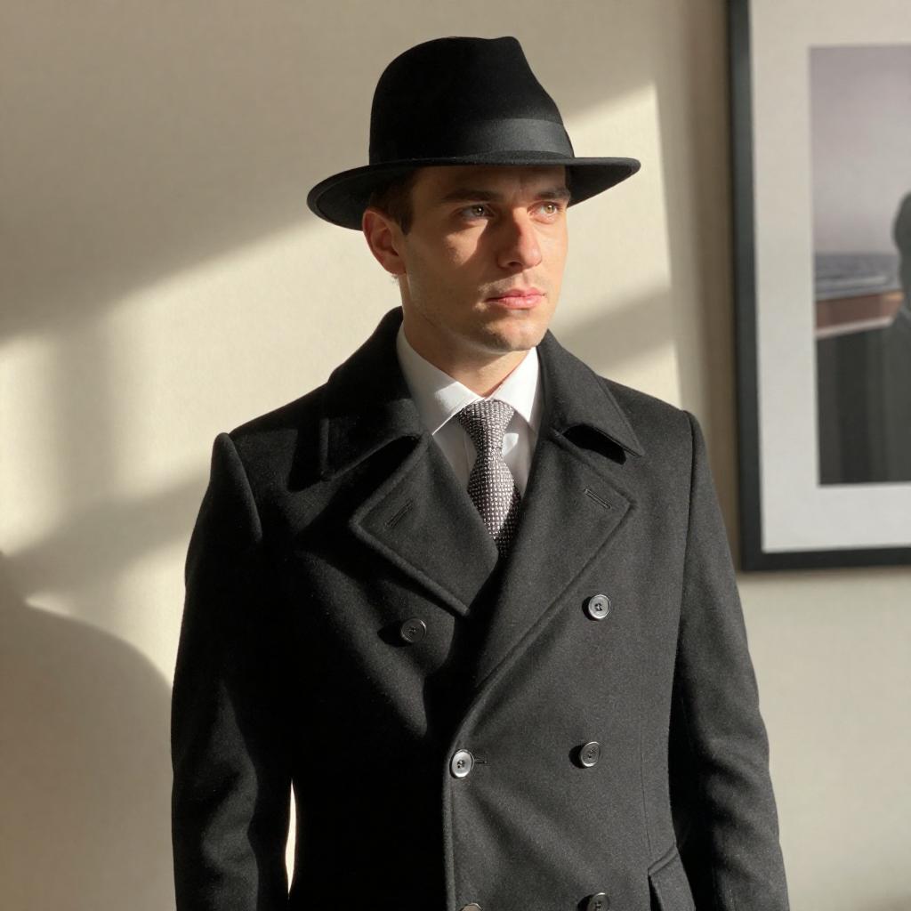 Photograph of two men in black suits and hats, standing against a white wall. The man on the right, with a light beard and intense gaze, faces the man on the left, who has his back to the camera. Bright sunlight casts strong shadows.