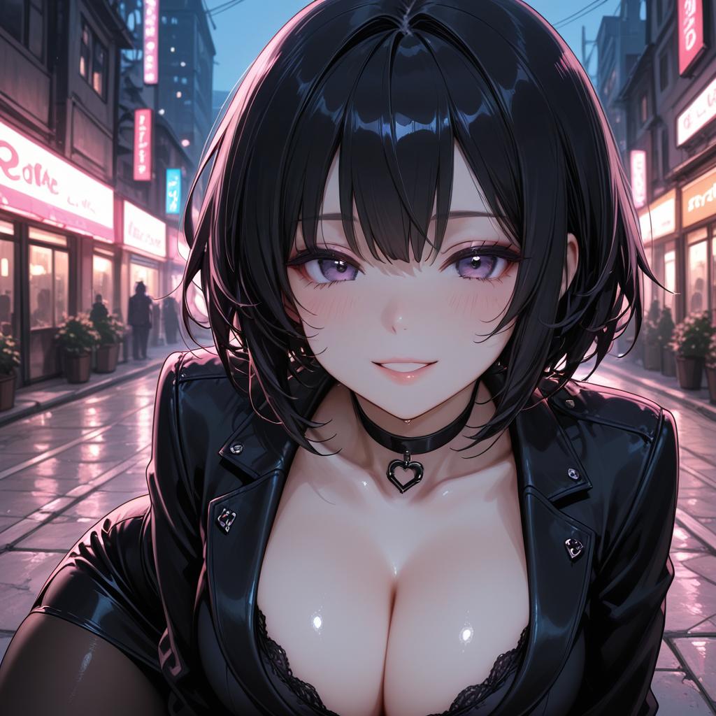 Beautiful, (masterpiece:1.2), (best quality:1.2), perfect eyes, perfect face, perfect lighting, gothgirl, 1girl, black choker, black eyes, black hair, black pantyhose, breasts, choker, cleavage, collarbone, black lips, grin, large breasts, lipstick, looking at viewer, makeup, miniskirt, outdoors, pantyhose, purple eyes, short hair, skirt, smile, solo