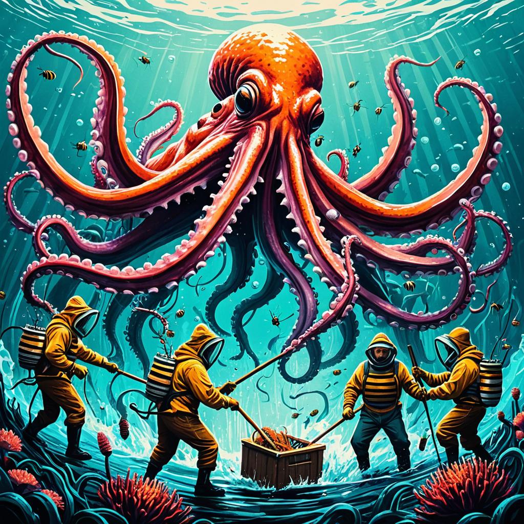 Fantasy art of a group of coral reef guardians battling a giant cartoony squid, muted colors, geometric shapes, underwater volcanic vent, playful tone, cartoonish and modern art style